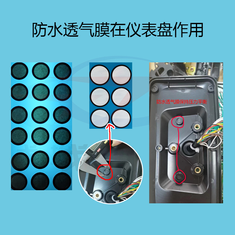 儀表盤中的電子元件在工作的時候,熱量就會在設備殼體內部積聚,這樣導致壓力增大。如果沒有防水透氣膜泄壓排氣使得殼體內外壓迅速平衡。從而達到儀表盤使用的壽命。